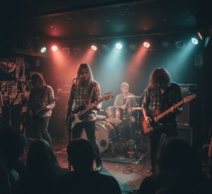 Prompt: [Grunge Rock Instrumental] Mid-tempo drum groove, gritty bass line, distorted rhythm guitar riffs, energetic but chill, underground club vibe, nineties alternative rock feel, raw production