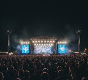 Prompt: [Arena Rock Ambient] Distorted electric guitar feedback drone, slow building drum beat, crowd cheering noise in background, anticipatory, energetic, raw power, huge stadium atmosphere, tension before the storm